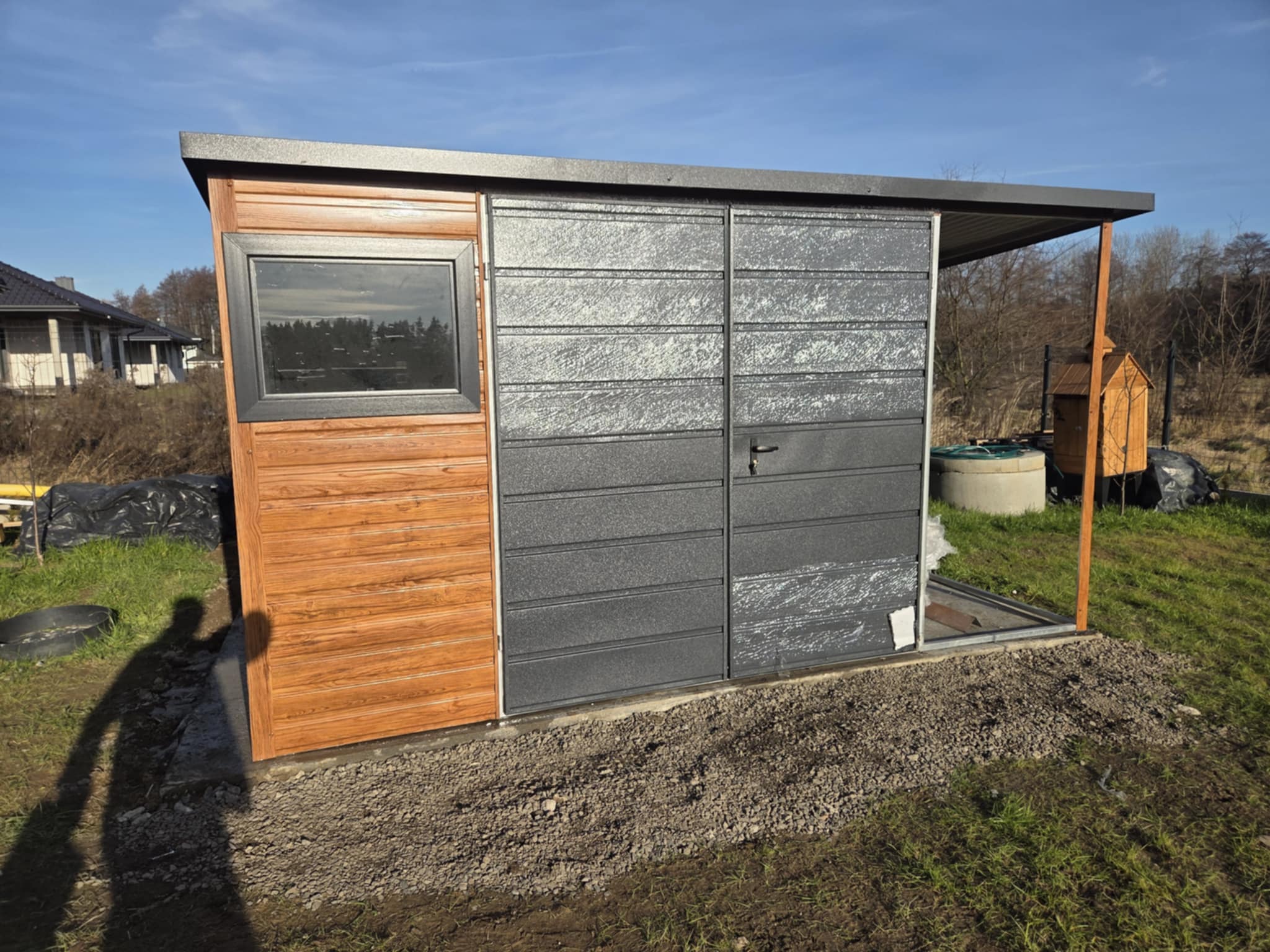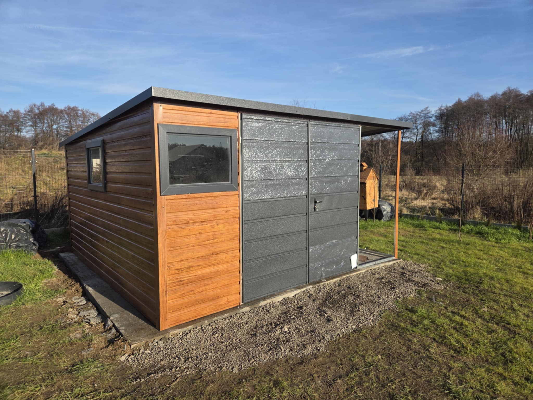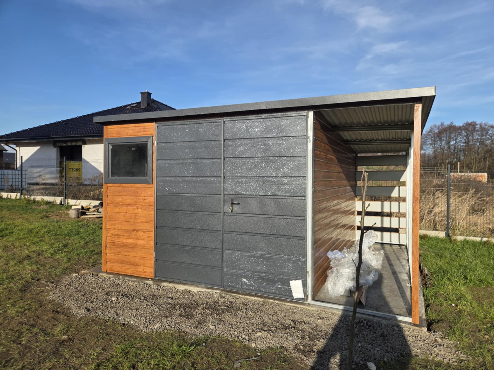 - szerokość garażu: 5 m (4m garaż + 1m wiata na słupkach z tyłem panelowym)