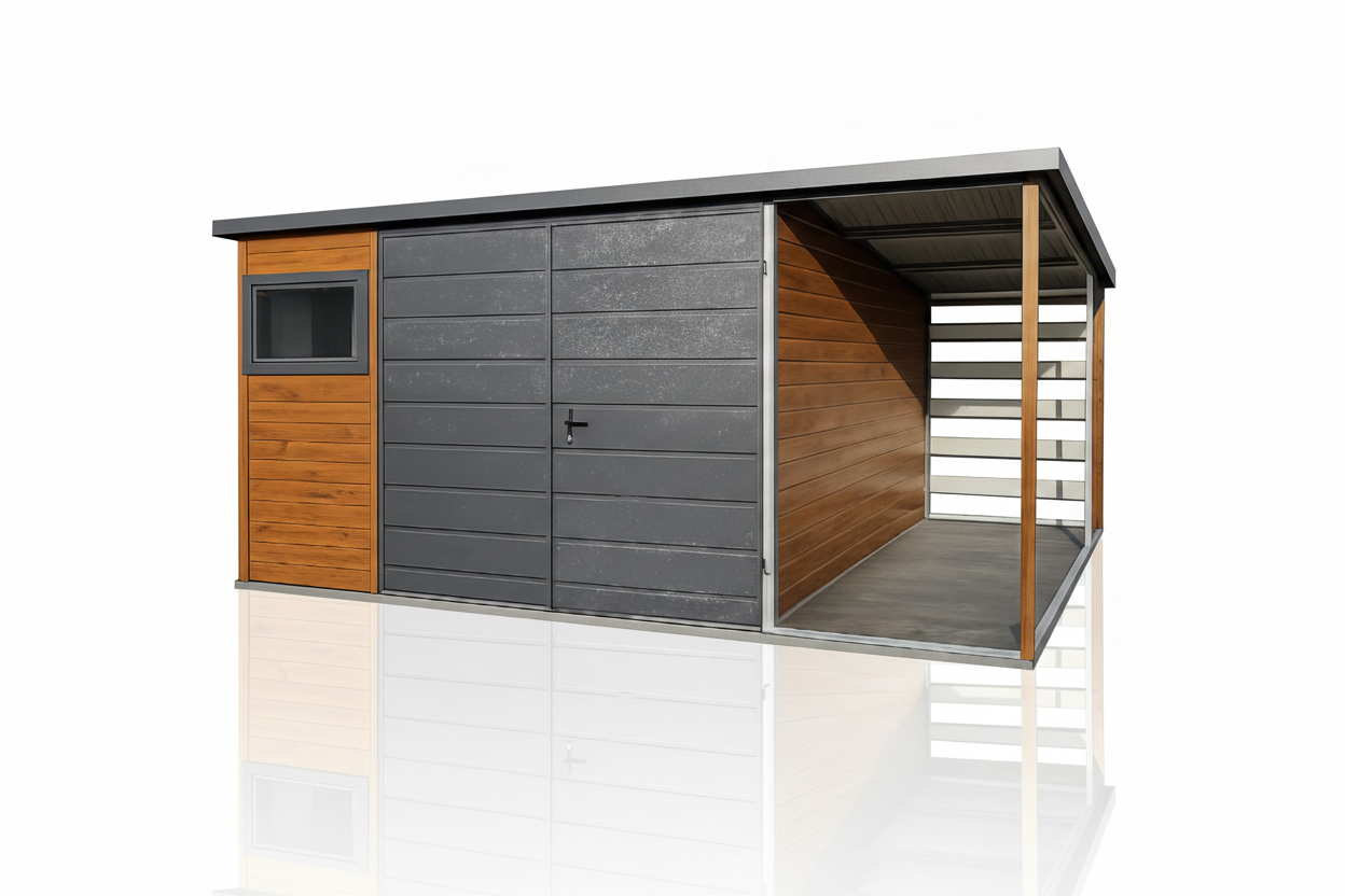 Domek narzędziowy ogrodowy 4×4 m z wiatą panelową 1 m Złoty Dąb + Ciemny Grafit