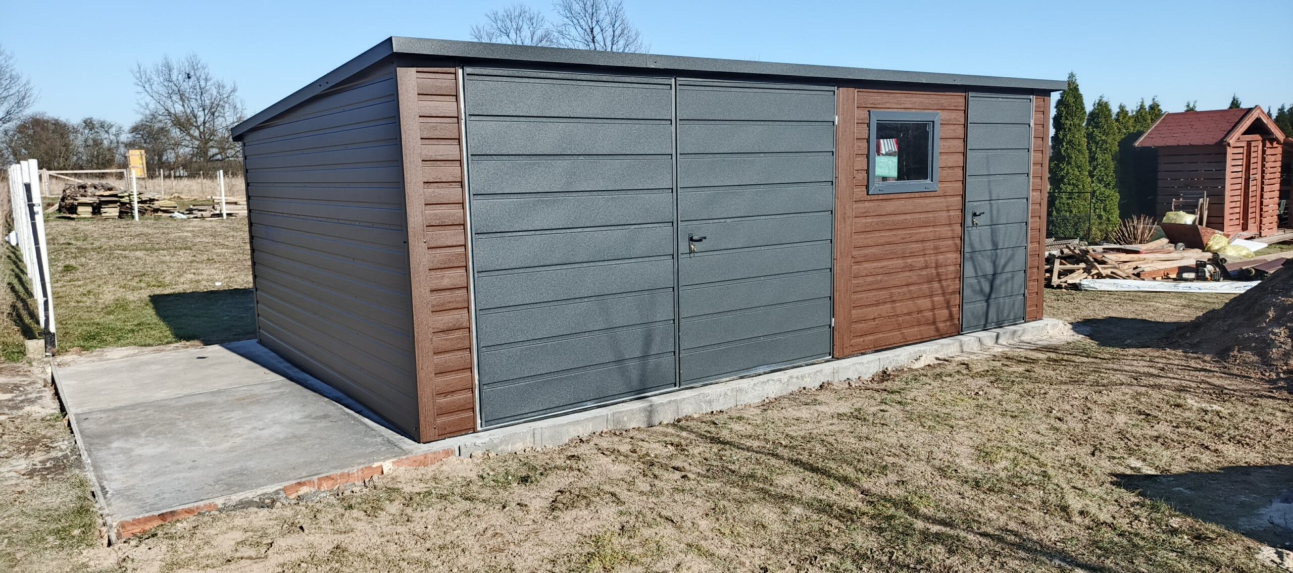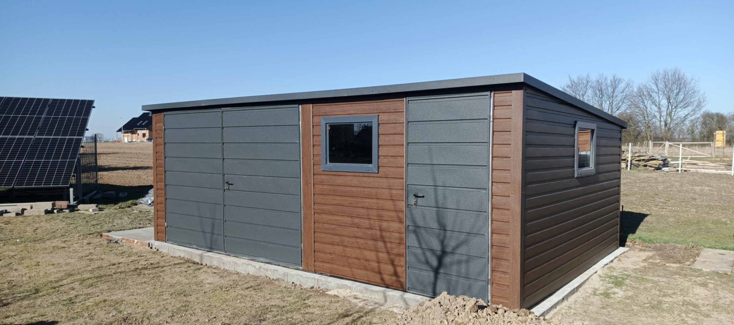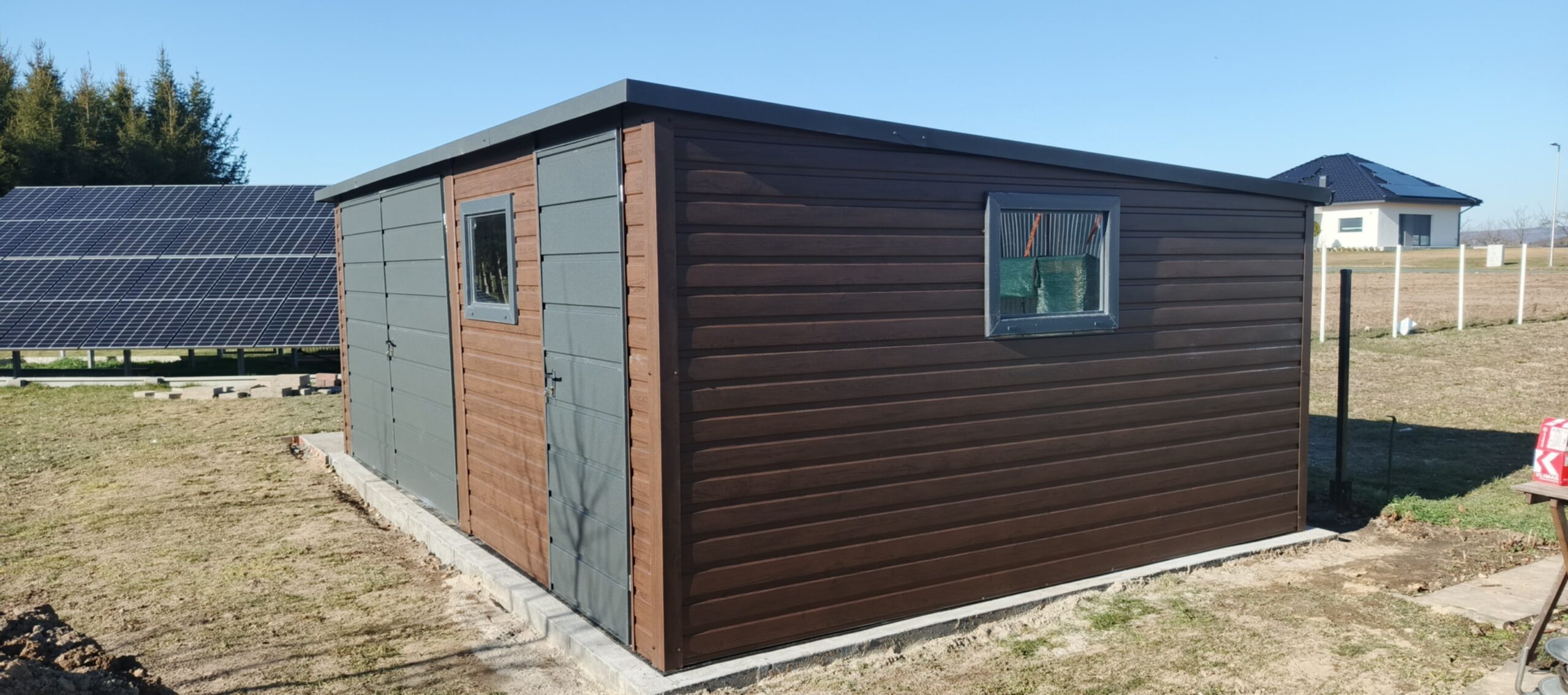 Wyposażony w funkcjonalną bramę dwuskrzydłową oraz 2x uchylne okno PCV, zapewnia nie tylko bezpieczeństwo, ale i dostęp naturalnego światła do wnętrza. Idealne rozwiązanie na działkę, do ogrodu czy przydomowego warsztatu.