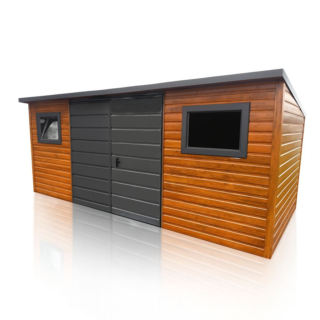 Wyposażony w funkcjonalną bramę dwuskrzydłową 2×2 oraz 2x Okno 80×60 zapewnia nie tylko bezpieczeństwo, ale i dostęp naturalnego światła do wnętrza. Idealne rozwiązanie na działkę, do ogrodu czy przydomowego warsztatu.