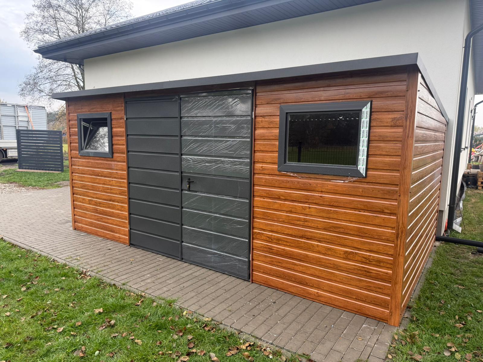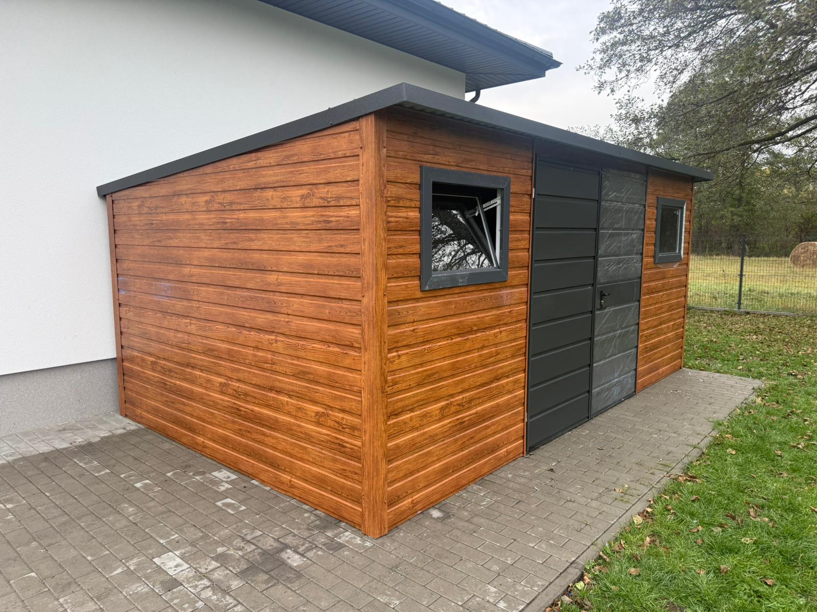 Nowoczesny domek schowek ogrodowy o wymiarach 5×4 m w eleganckim kolorze Drewno + Ciemny Grafit MAT.