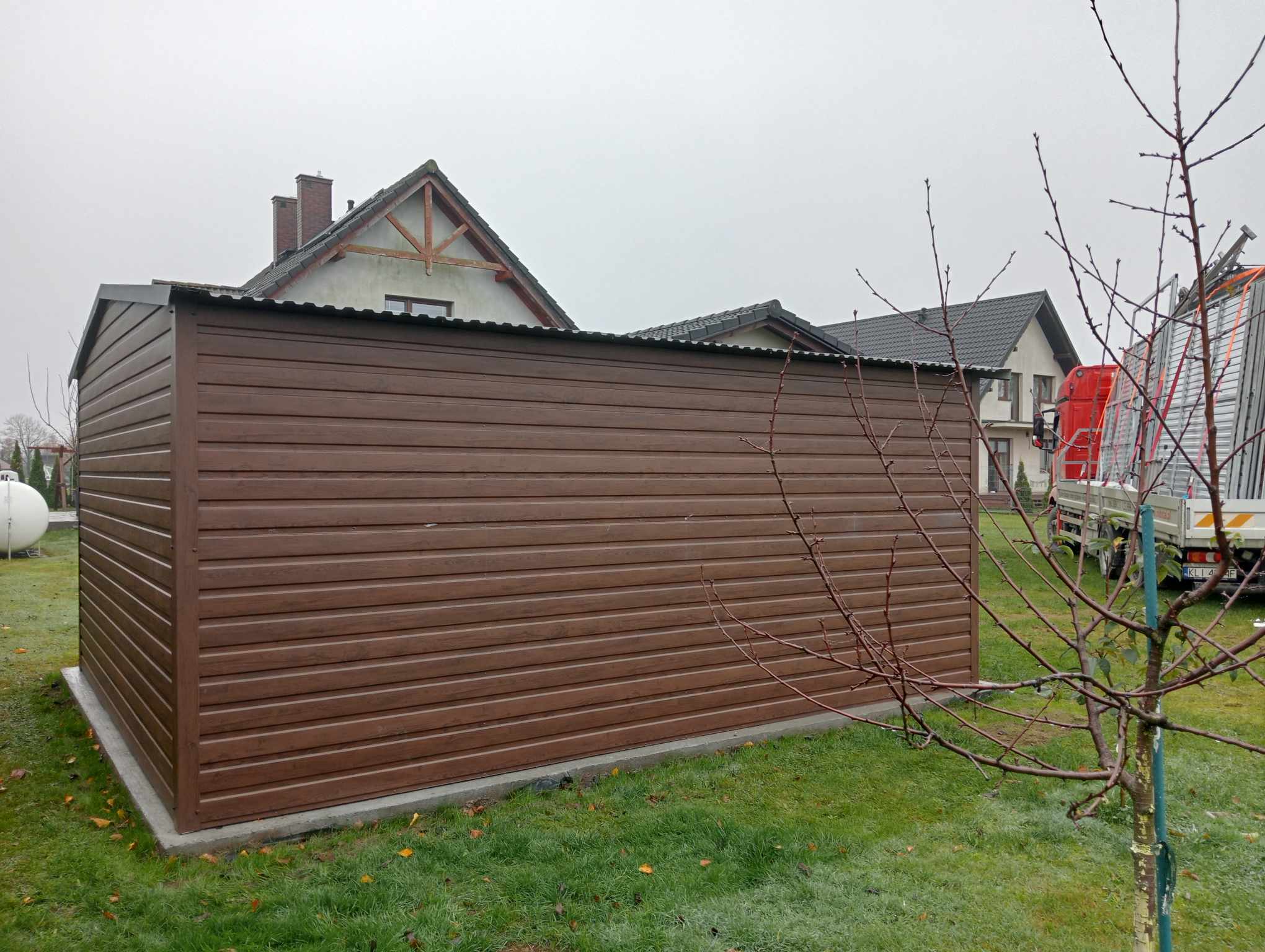 Ściany garażu obite są blachą trapezową ciemny orzech w układzie poziomym T14. Brama garażowa wykonana jest z szerokiego poziomego panelu w kolorze ciemny orzech. Dach garażu pokryty jest wzmocnioną blachą trapezową o profilu T-14 w kolorze ciemny brąz MAT