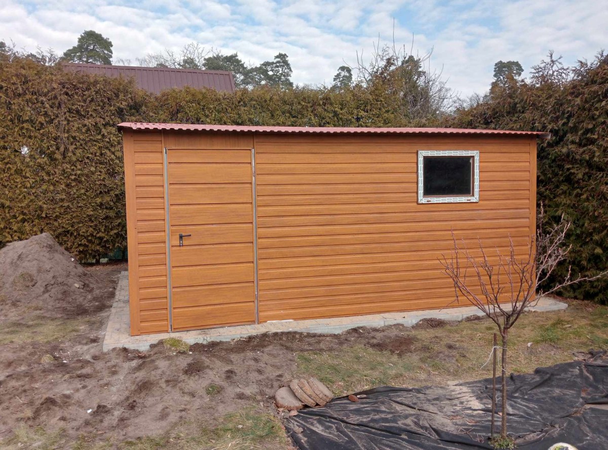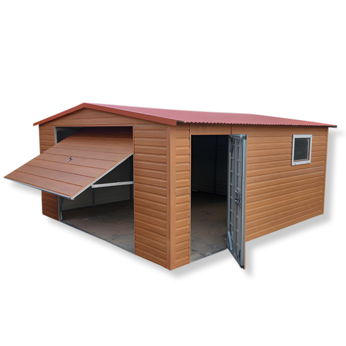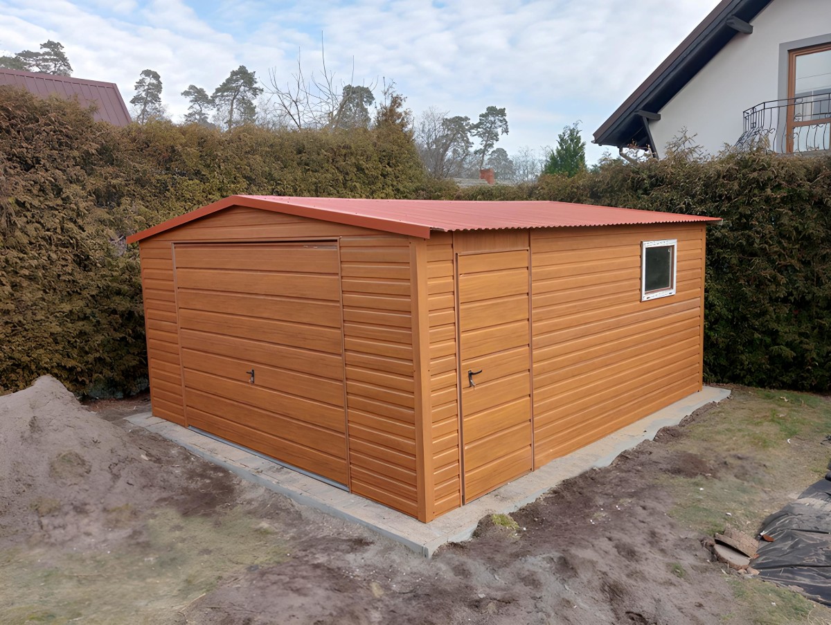 Garaż Blaszany 4x5m – Dach dwuspadowy, Brama uchylna, złoty dąb