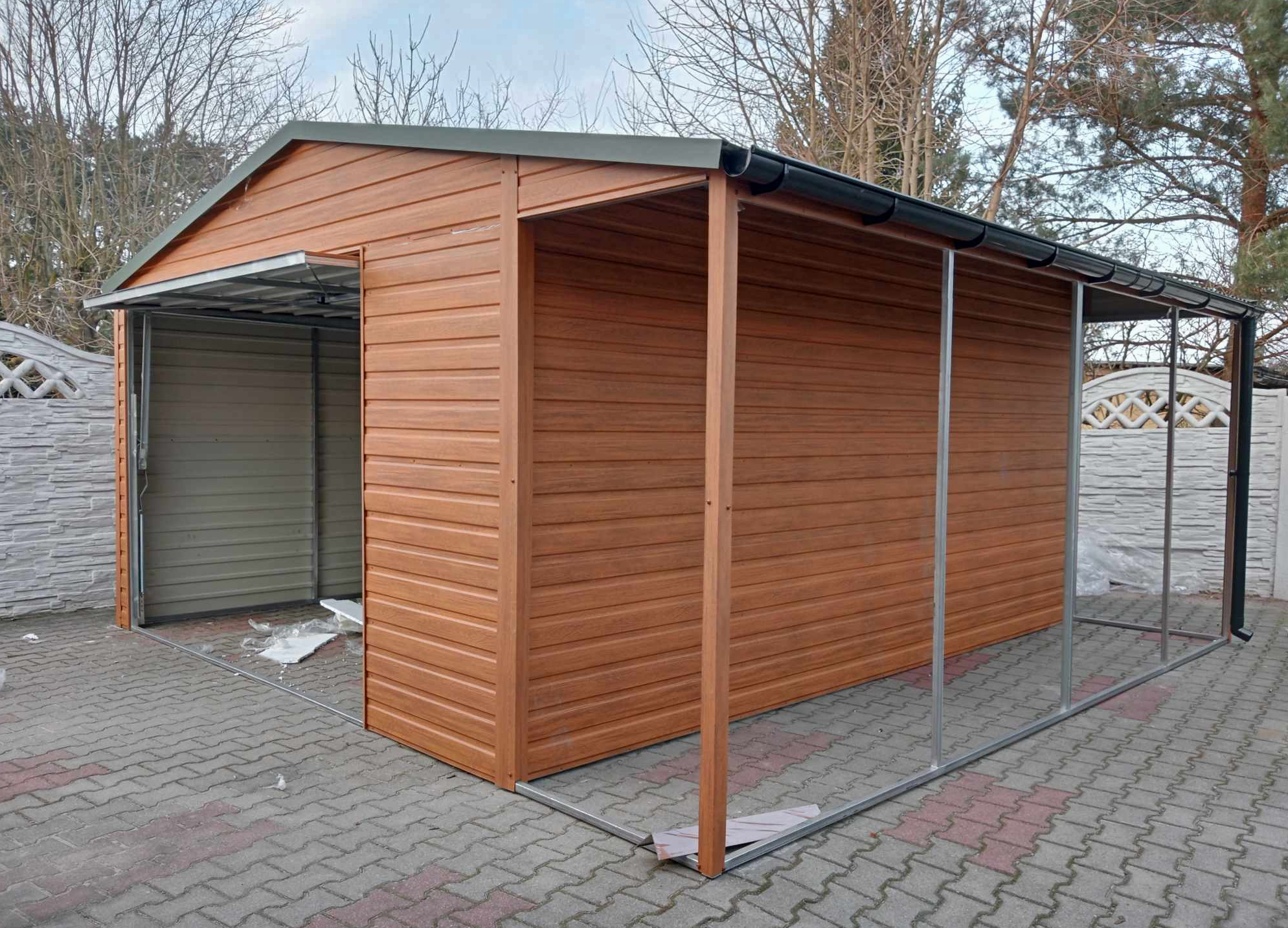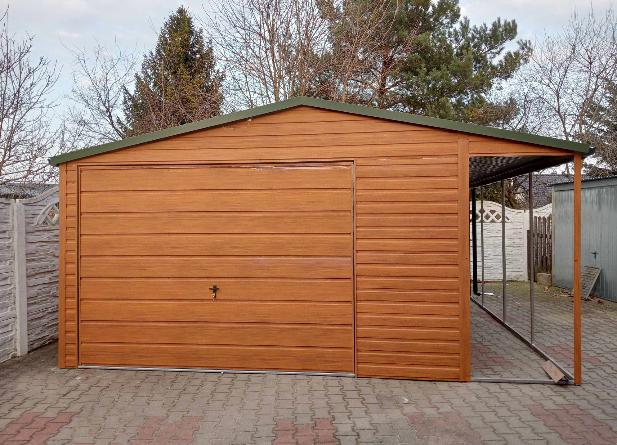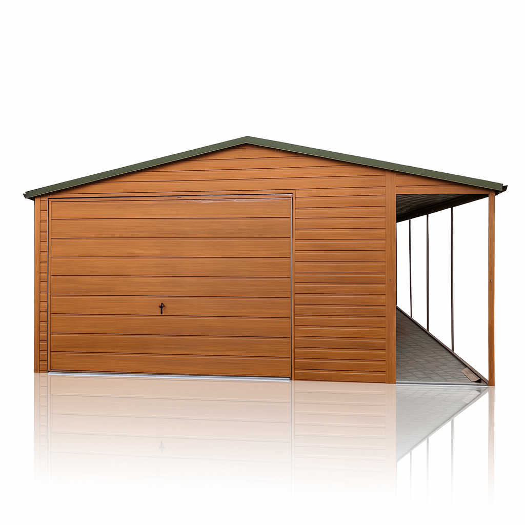 Garaż Blaszany 4×6 Złoty Dąb z Wiatą 1×6 na Słupkach – Profil Ocynk, Dach Dwuspadowy