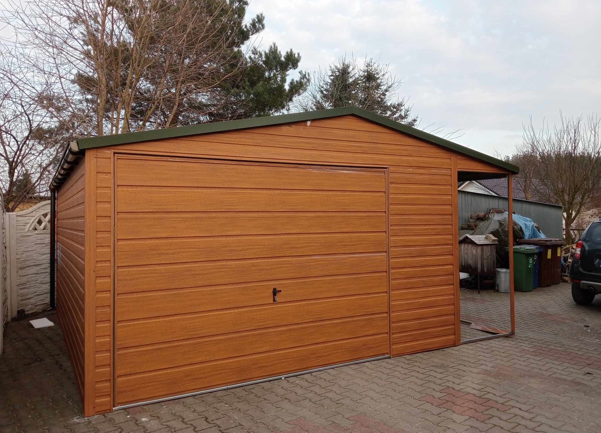 Ściany garażu obite są blachą trapezową Złoty dąb w układzie poziomym. Brama garażowa wykonana jest z szerokiego poziomego panelu Dach garażu pokryty jest wzmocnioną blachą trapezową o profilu T-14 w kolorze ciemna Zieleń MAT
