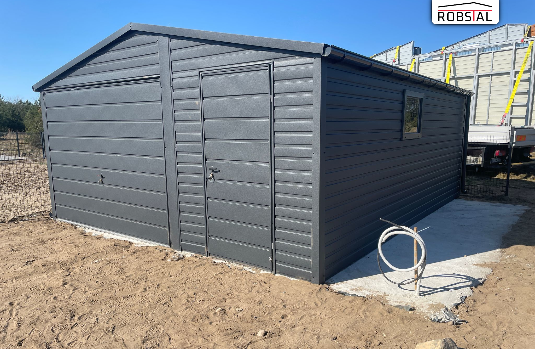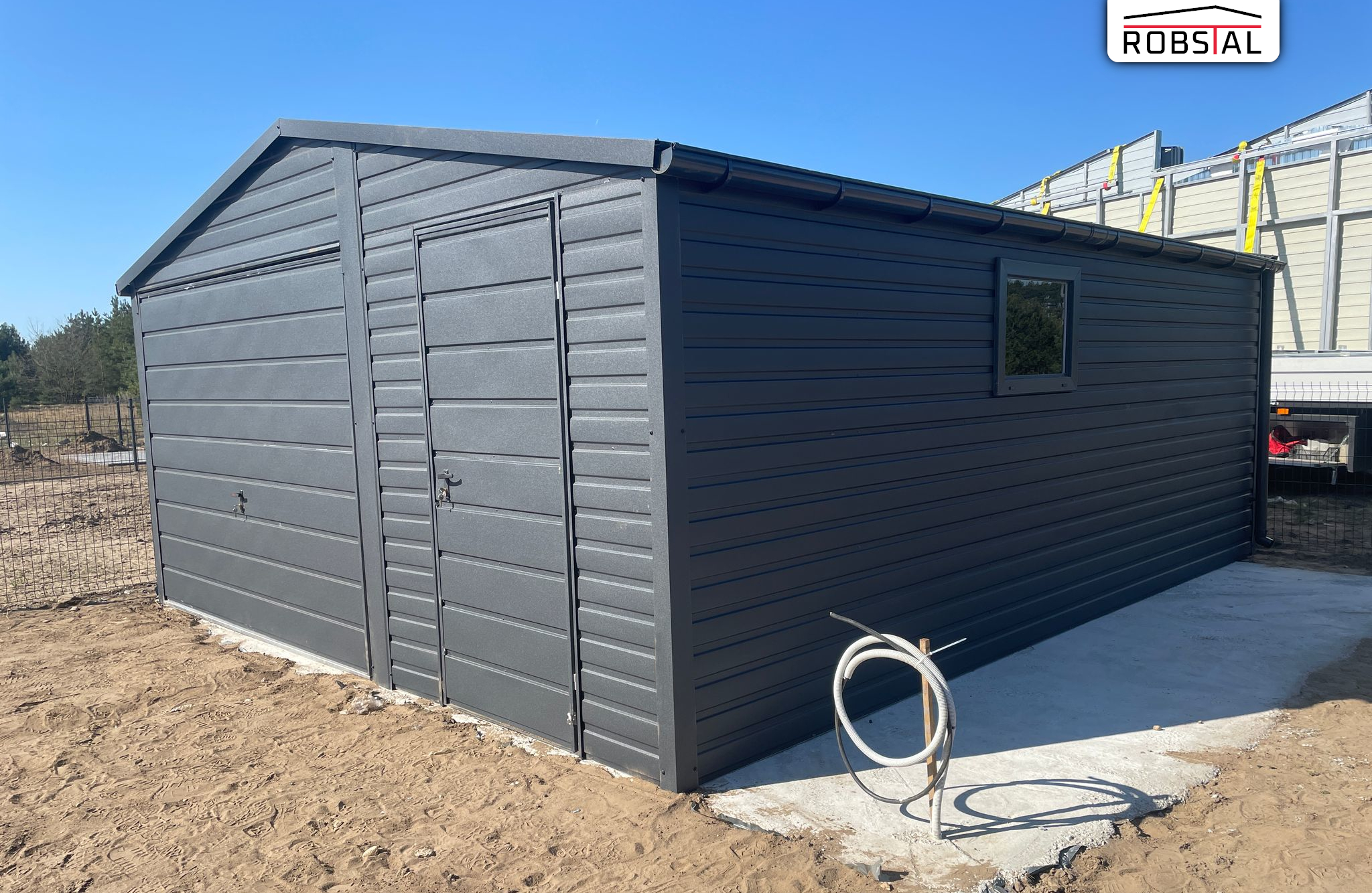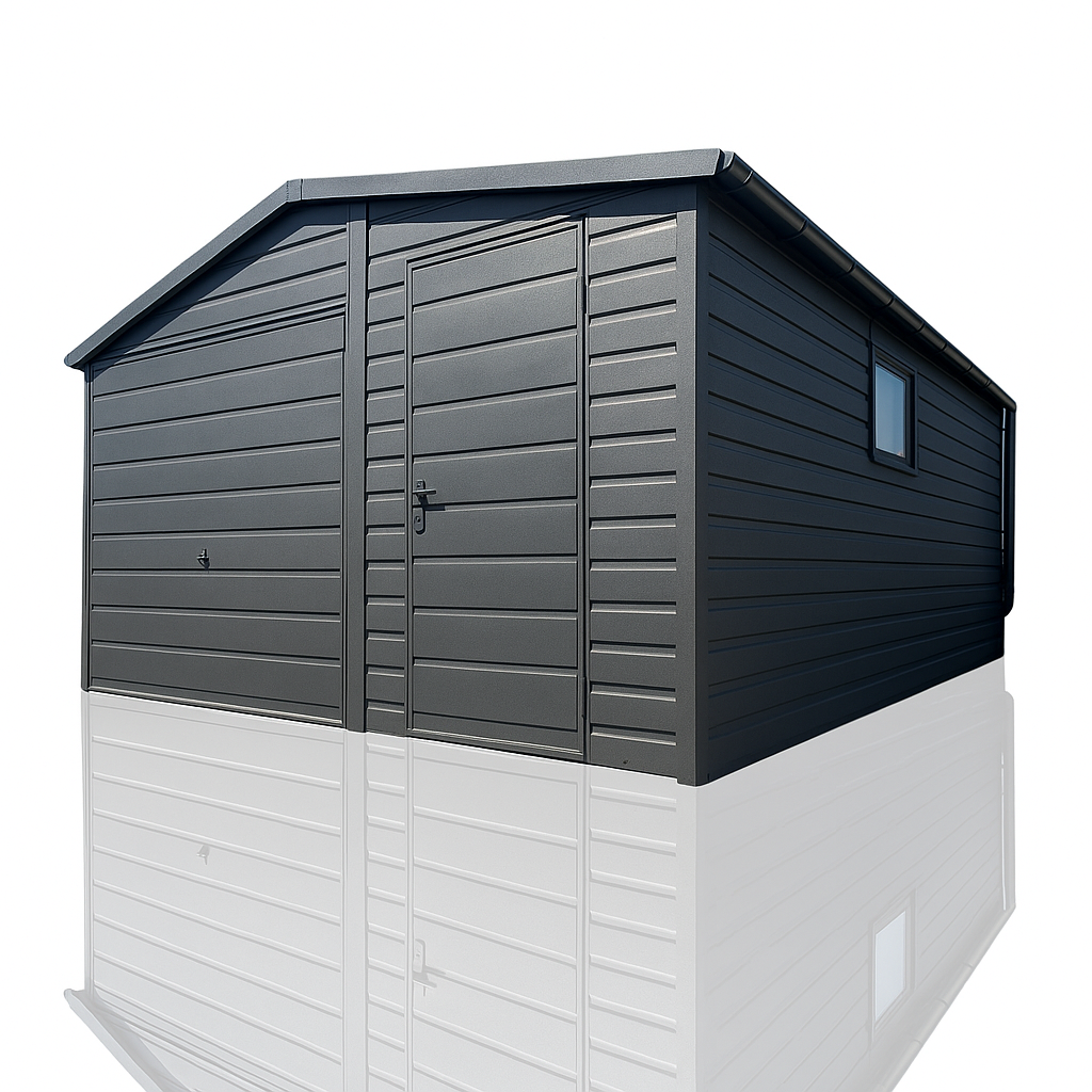 Garaż blaszany 5×5 blaszak jednostanowiskowy dach dwuspadowy grafit MAT PREMIUM