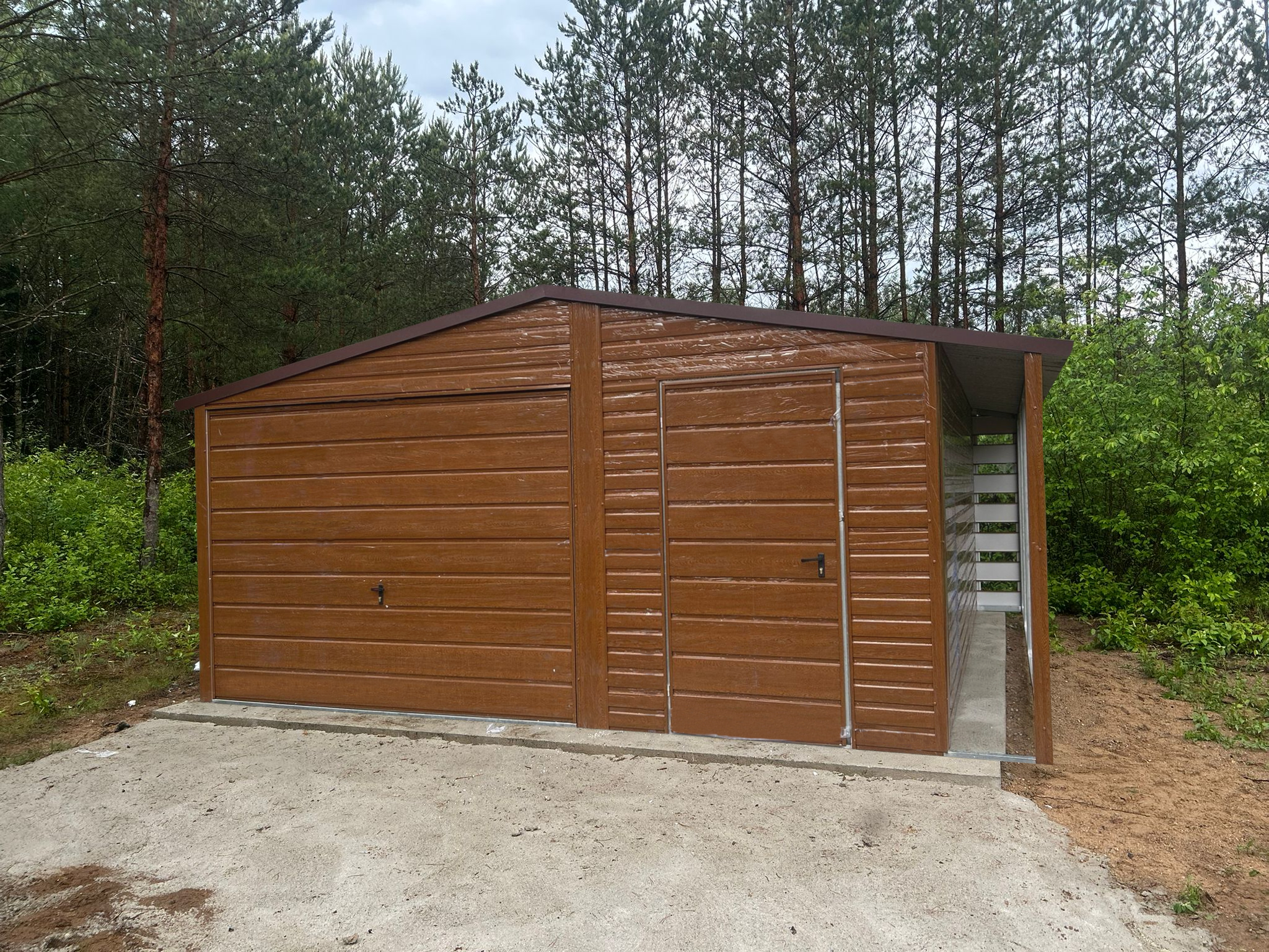 Garaż blaszany dwuspadowy z wiatą panelową 5.5x5m