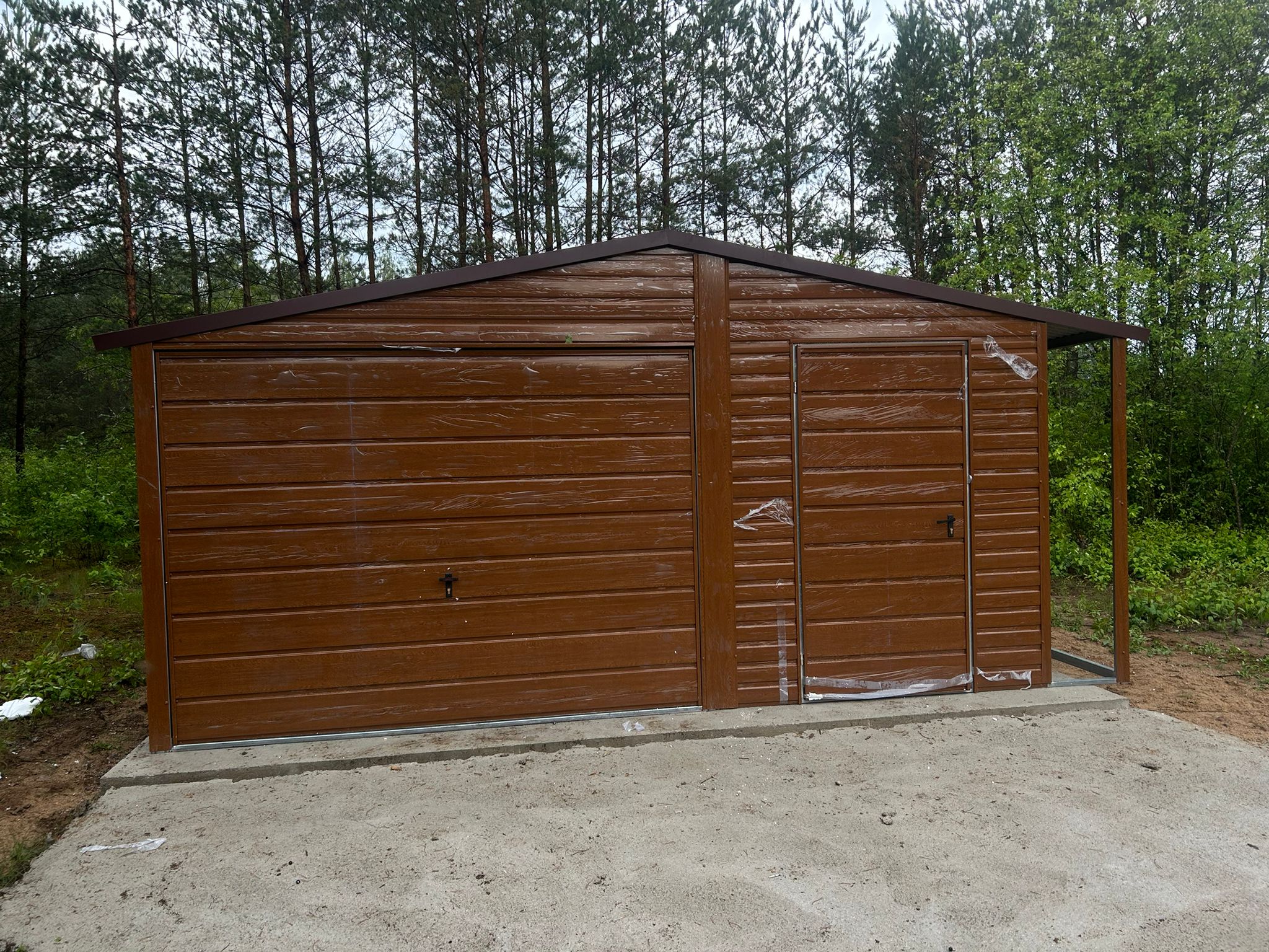 Garaż Blaszany 5×5 + Wiata panelowa 0.5×5 Dach Dwuspadowy Złoty Dąb PREMIUM