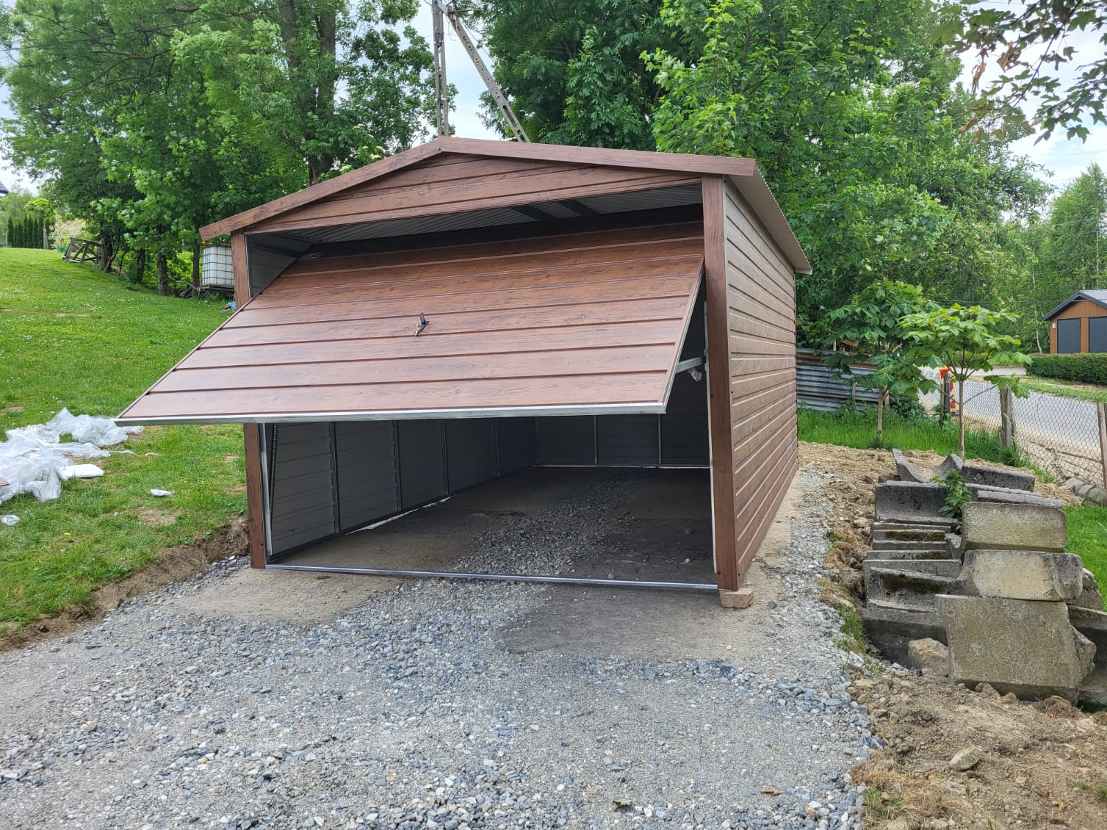 Garaż blaszany drewnopodobny 3×5 PREMIUM – dwuspadowy , brama uchylna