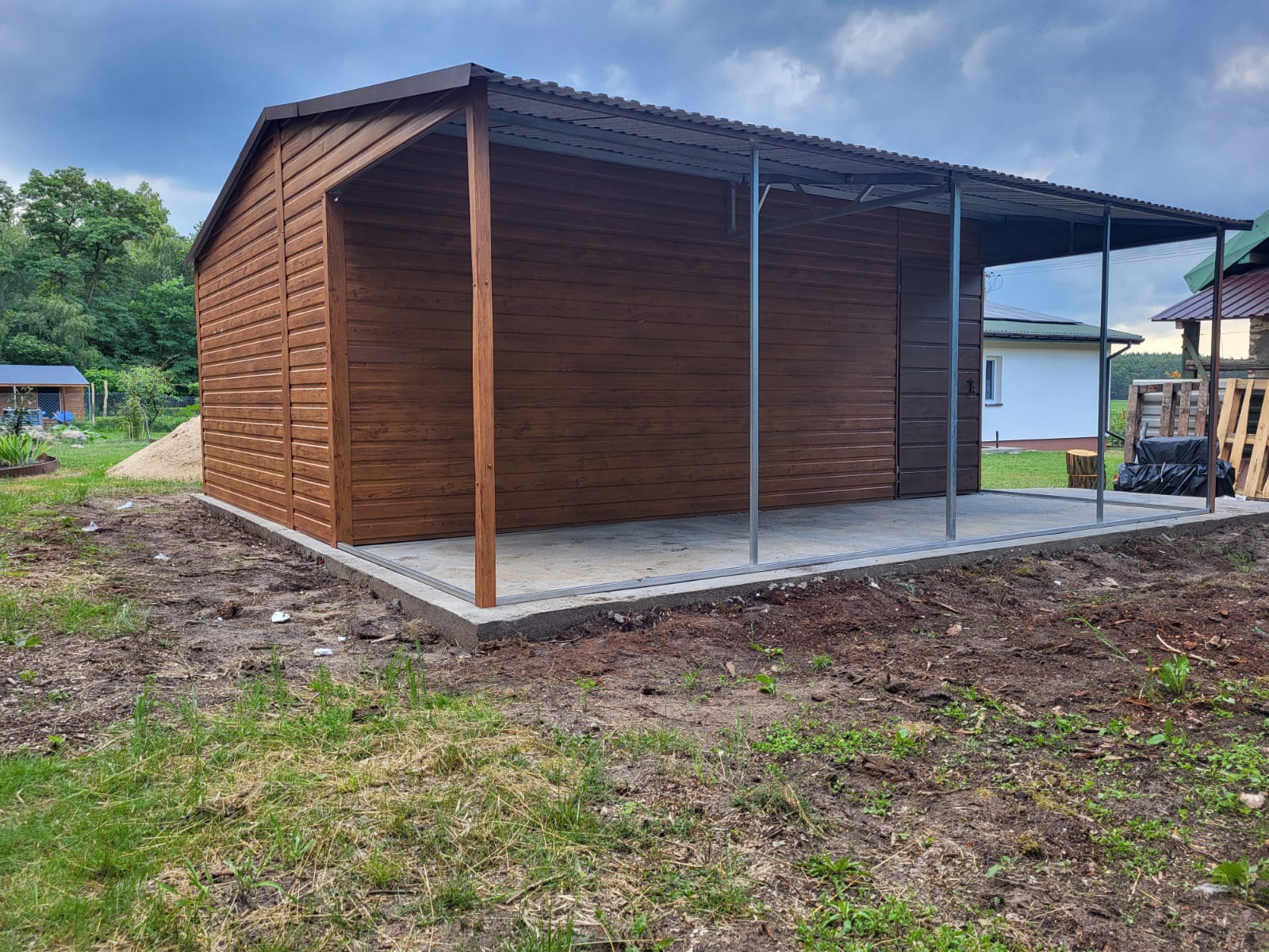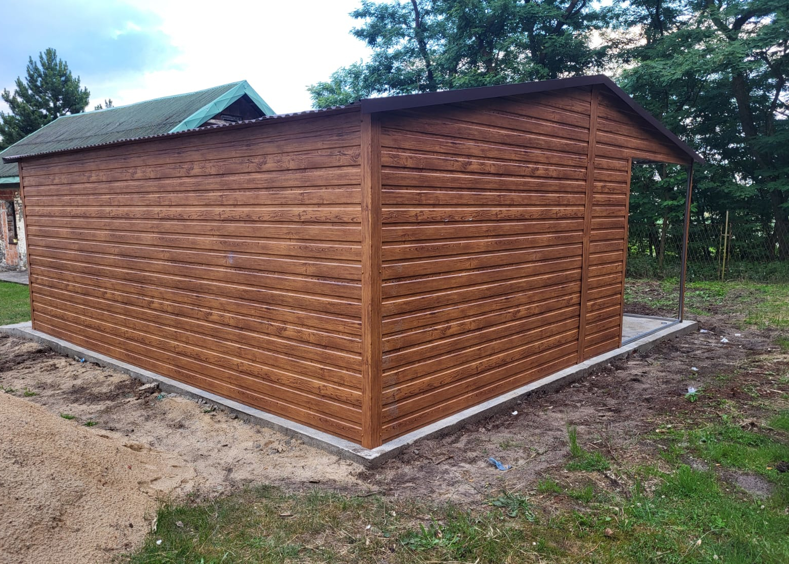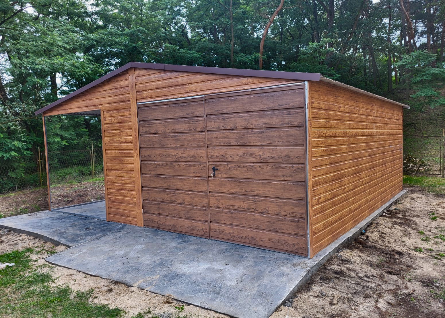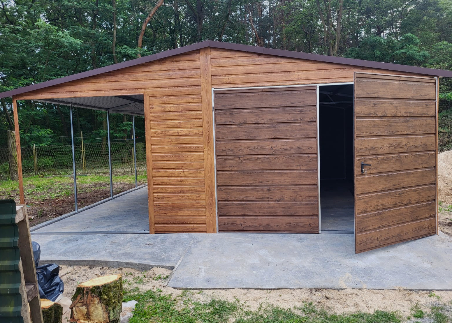 Garaż Blaszany drewnopodobny 4×5 + 2×5 wiata na słupkach PREMIUM