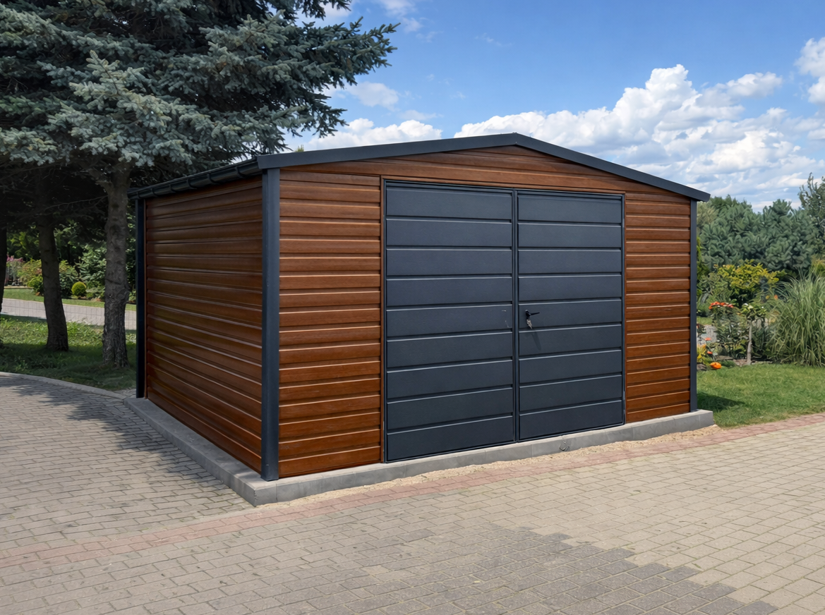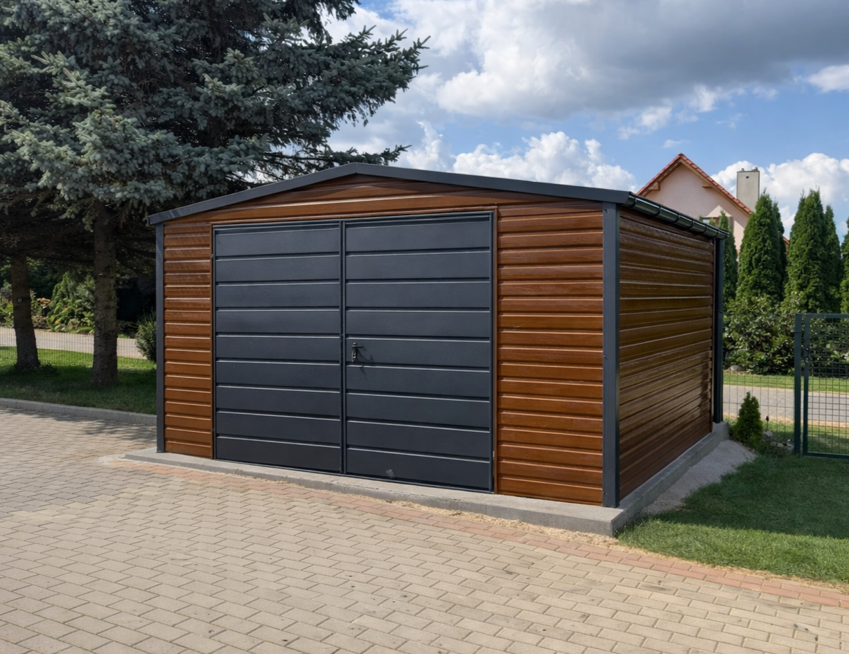 Garaż Blaszany dwuspadowy 4×5 Złoty Dąb + Ciemny Grafit – Model Premium