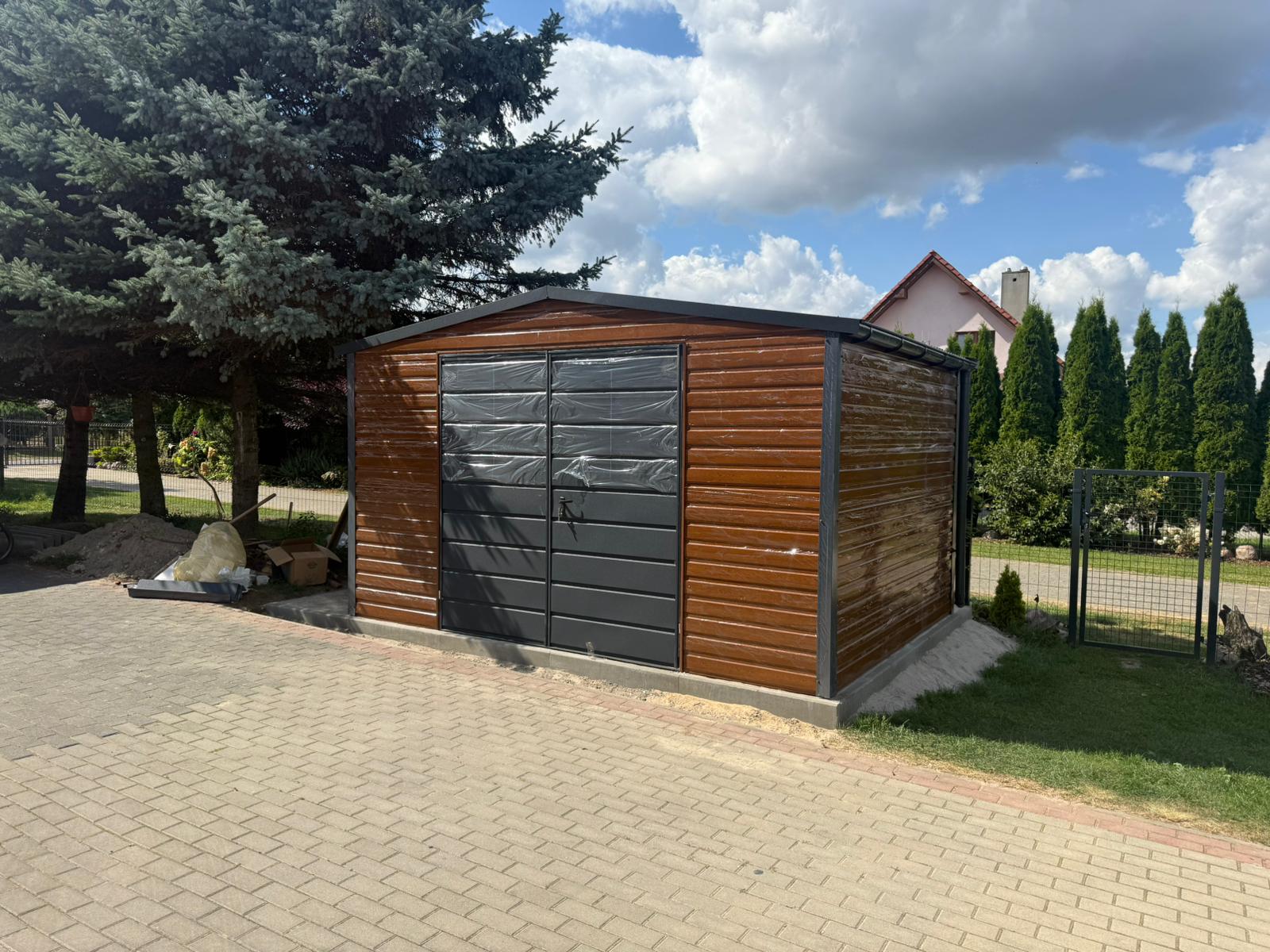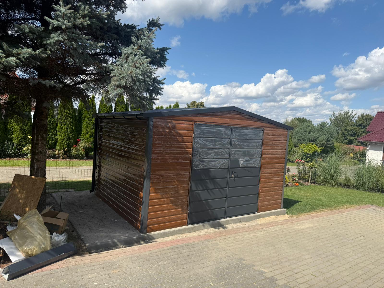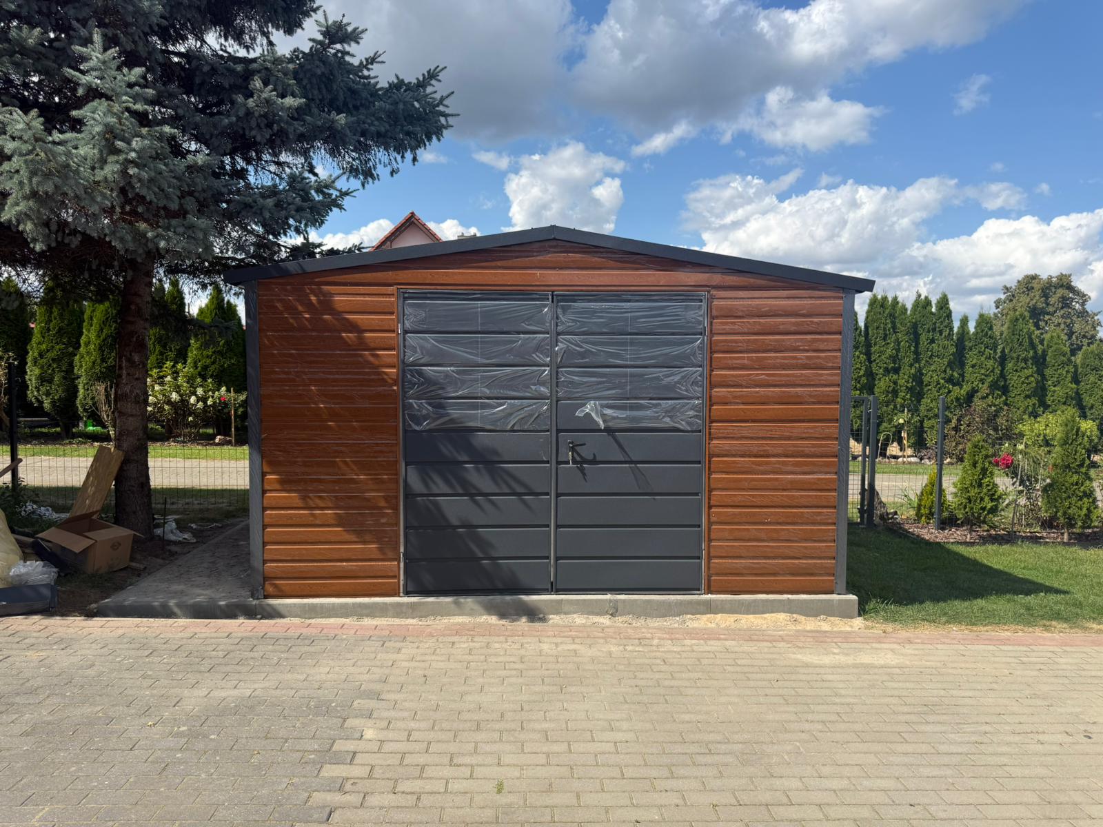 Garaż Blaszany dwuspadowy 4×5 Złoty Dąb + Ciemny Grafit Brama dwuskrzydłowa