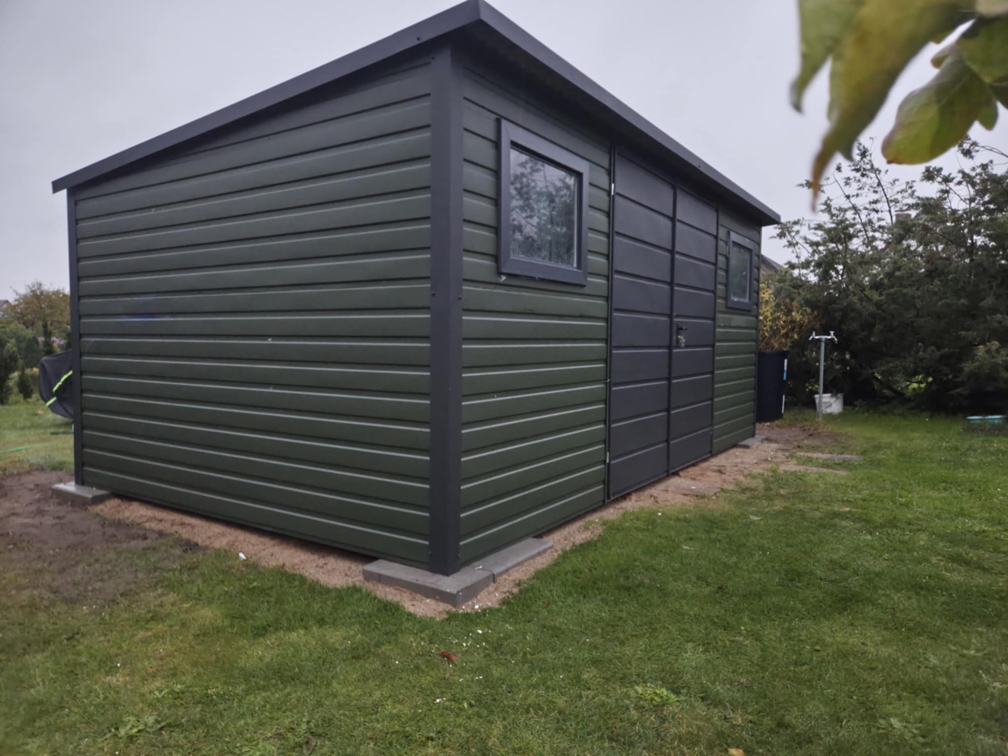 Stwórz praktyczne i stylowe miejsce do przechowywania z nowoczesnym domkiem ogrodowym o wymiarach 6×4m w eleganckim kolorze Zielony Mat + Grafit MAT.